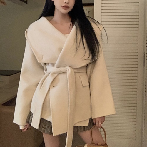 만남 겨울 카멜 울 숏코트 루즈핏 벨트 자켓 데일리룩 하객룩 오버핏 숏자켓 베이지 키작녀 코트