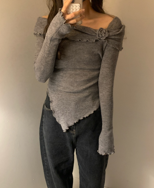 [말라보여요/여리여리~] 카리나 윕플래시 골지 러플 장미 오프숄더 니트 언발 티셔츠