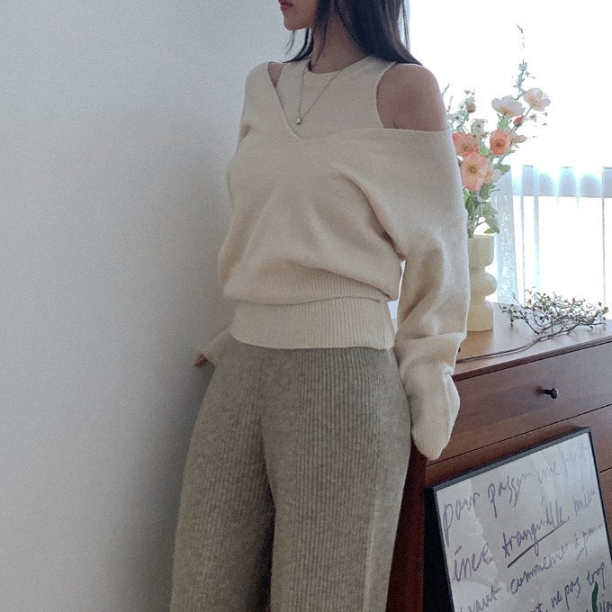 [ 레이어드템/나시세트 ] 논케 딥브이넥 니트 크롭 나시 셋업