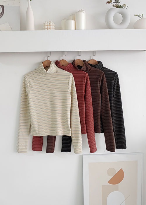 단가라목폴라 스트라이프 세미 크롭 터틀넥 여성티