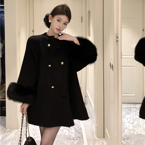 물끄 겨울 하객룩 퍼 트리밍 A라인 케이프 하프코트 모직 더블 버튼 오버핏 블랙 클래식 연말 파티룩