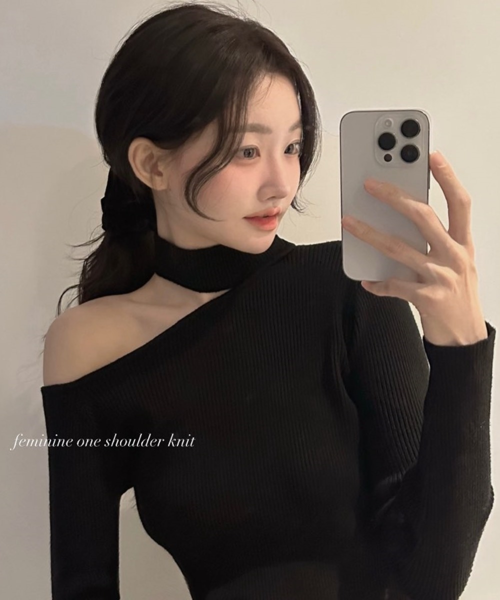 [절대실패없는 블랙🖤페미닌] 원숄더, 어깨 트임 초커넥 골지 긴팔 니트