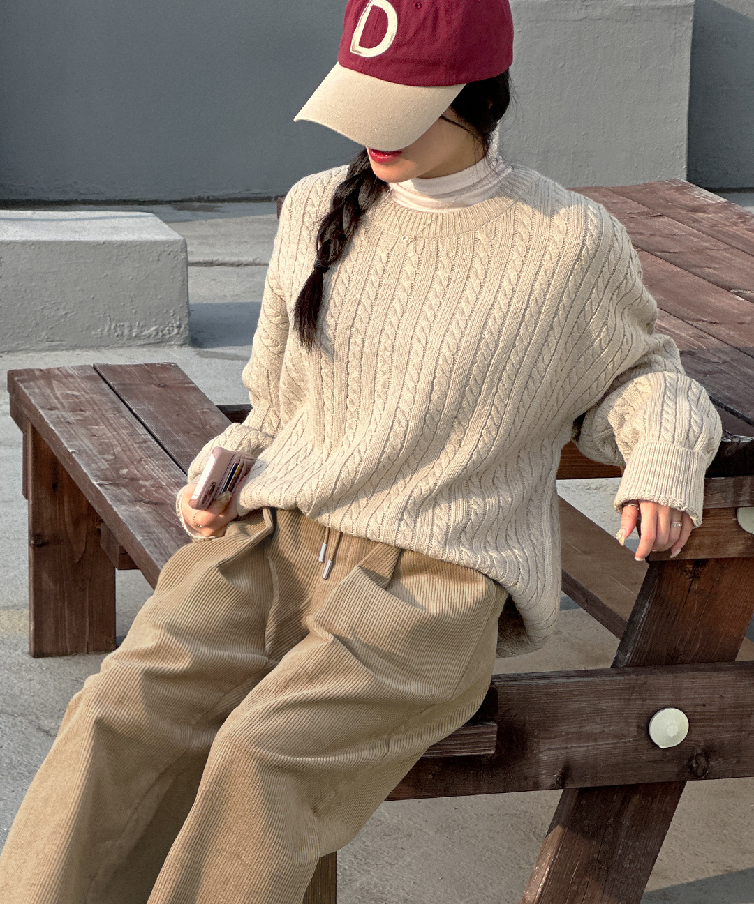크루넥 오버핏 케이블 스웨터 니트 [베이지]