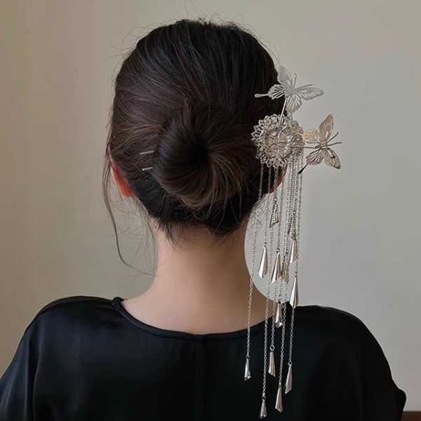 나비 실버 체인 올림머리 장신구 여성 비녀 헤어핀