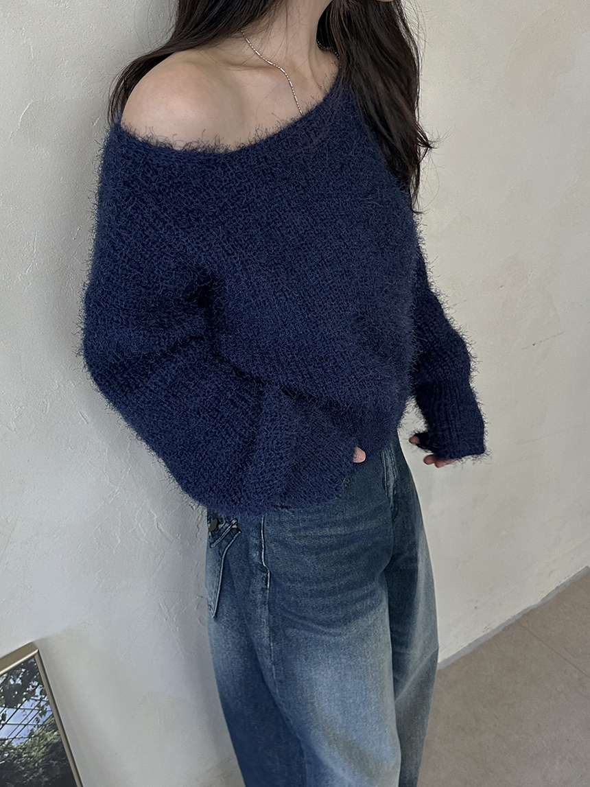 부클 오프숄더 루즈핏 긴팔 퍼 니트 2col