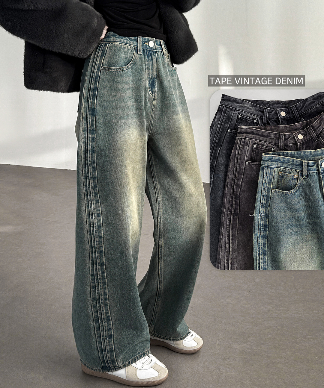 당일출고🚀[+기모추가🔥made🖤숏/롱ver] 하이웨스트 빈티지 워싱 테이프 와이드 롱 데님팬츠 3color