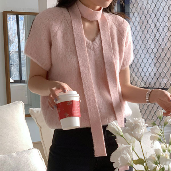 브이넥 우아한 반팔 니트 스카프 세트 니트 #42140896 C#-7515#