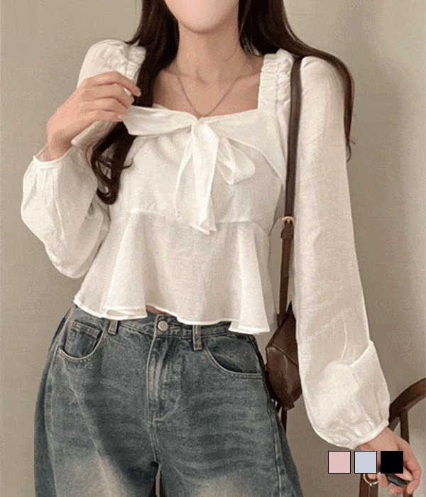 [무료배송] 소개팅 스퀘어넥 리본 플레어 투웨이 블라우스