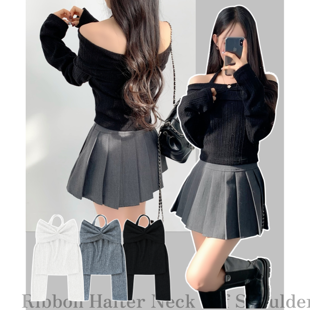 🔥1+1할인 EVENT🔥[여리무드/오프숄더🤍] 리본 홀터넥 오프숄더 긴팔티셔츠 니트티셔츠