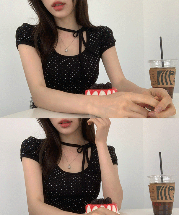 반팔&긴팔 로디 도트 퍼프 스퀘어넥 리본 초커 슬림핏 반팔티 긴팔티 2color[하객룩/데이트룩/땡땡이/나들이/벚꽃/초커리본/퍼프티/도트반팔/리본반팔]