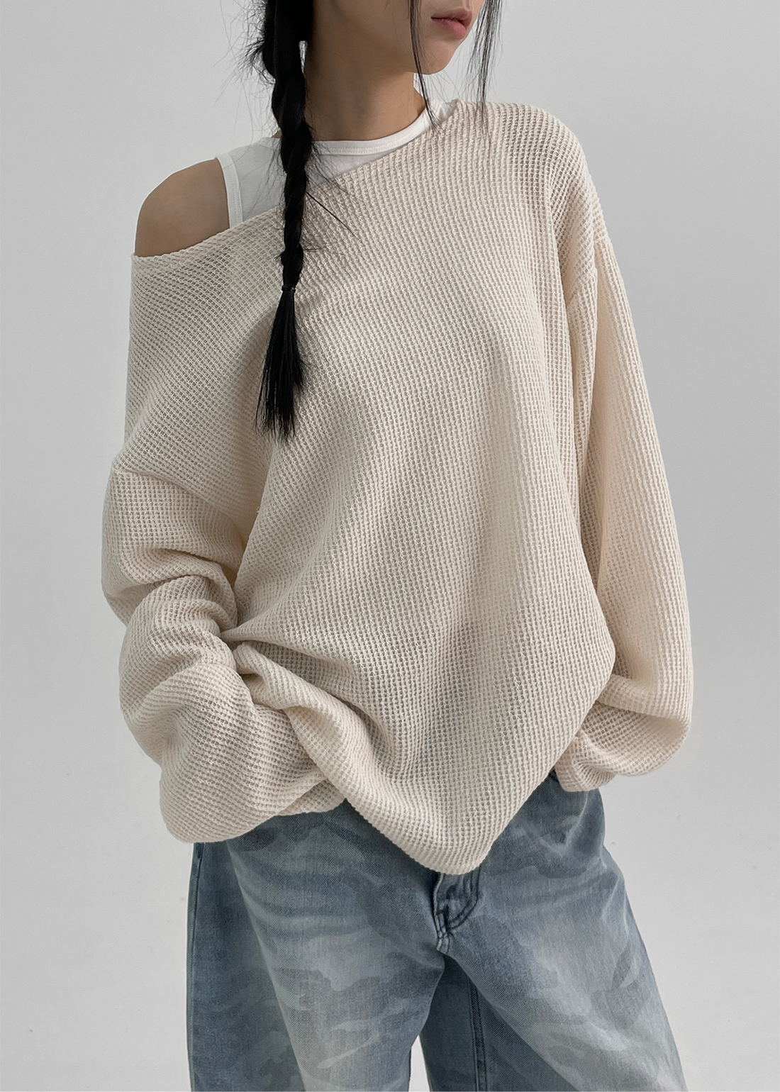 (UNISEX) 워벨 오버핏 보트넥 와플 니트