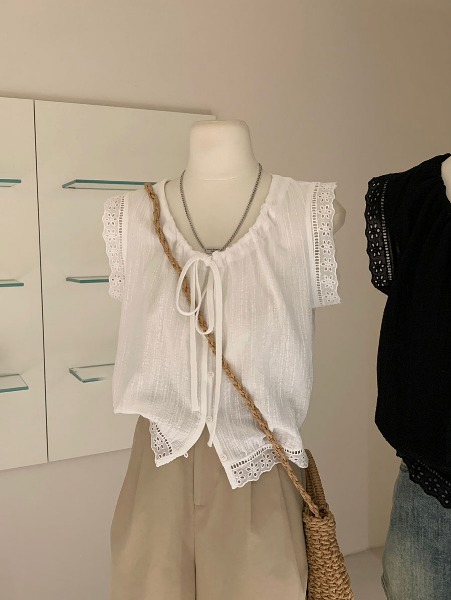 레이스 라인 스트라이프 스트링 민소매 블라우스-2컬러