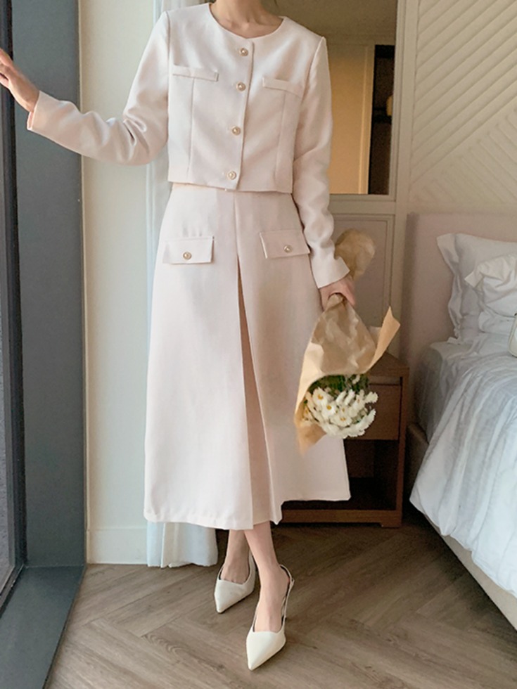 [프리미엄원단✦/하이퀄리티/상견례프리패스룩] [44-120] 블리티엔 트위드 자켓 맞주름 밴딩 롱 투피스 세트 (신상-봄-하객룩-격식룩-결혼식-데이트룩-빅사이즈-120사이즈-자체제작-셋업-투피스세트-결혼식 )