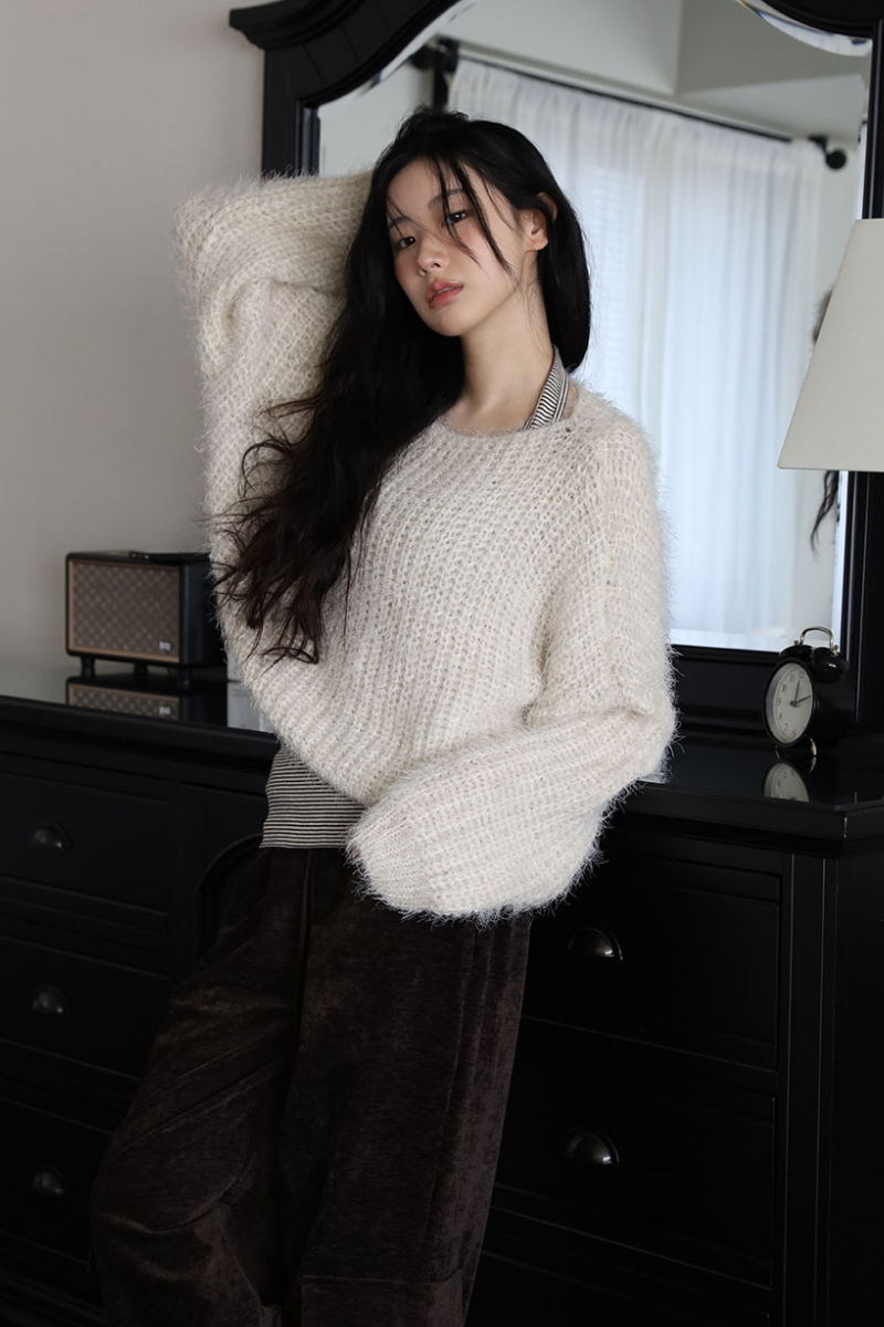 솔잎 퍼 크롭 보트넥 니트