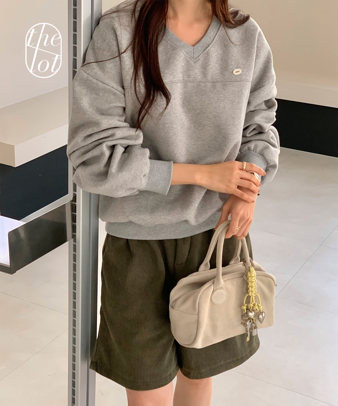 (당일) (쭈리/기모) 오로라 포인트뱃지 브이넥 긴팔 맨투맨 (4color) 일상룩/봄/가을/겨울/데일리룩/스웻셔츠