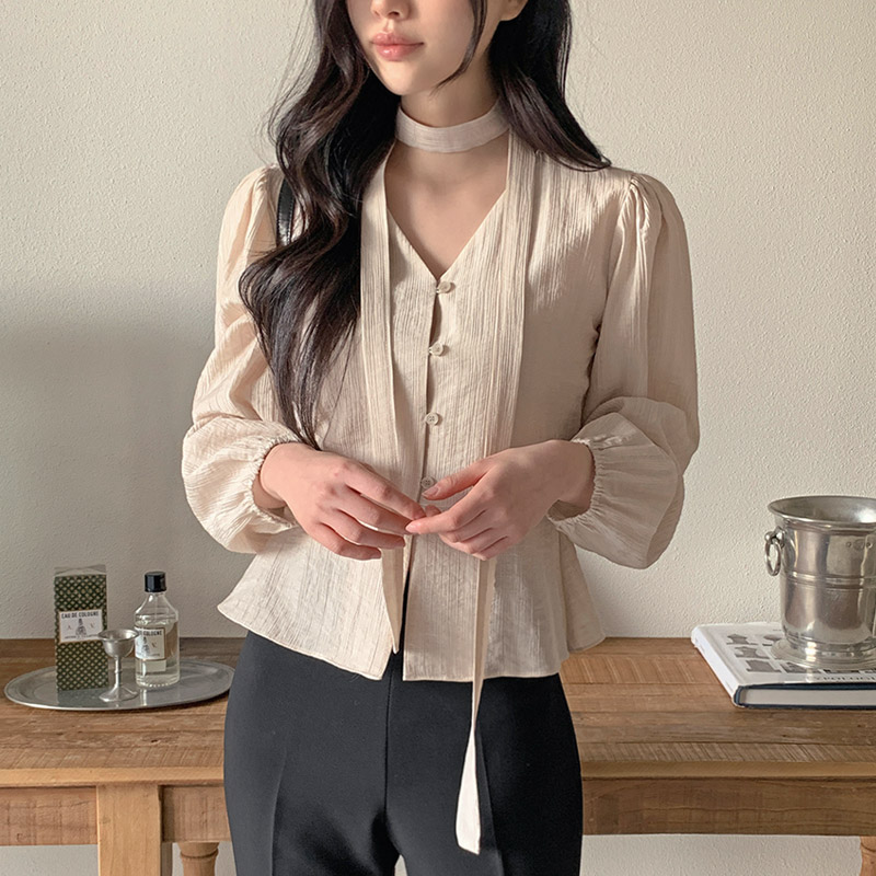 [페블럼블라우스] [tbs0445] 오제나 타이 브이넥 블라우스(타이블라우스,단추블라우스,퍼프블라우스,브이넥블라우스,하객룩,데이트룩)
