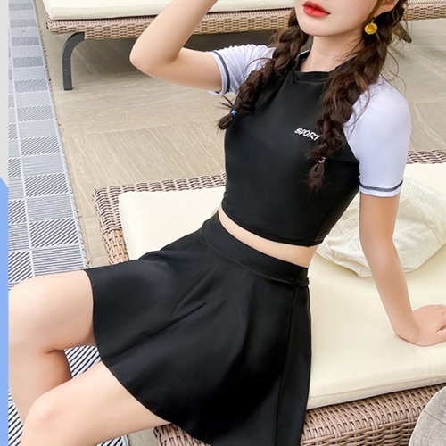 키이샤 블랙 래쉬가드 투피스 수영복 휴양지룩 플레어 치마 속바지 원피스 반팔 크롭탑 티셔츠 스윔 비치 웨어 체형커버 레쉬가드 바캉스룩 커버업 휴가룩 래시가드 코디