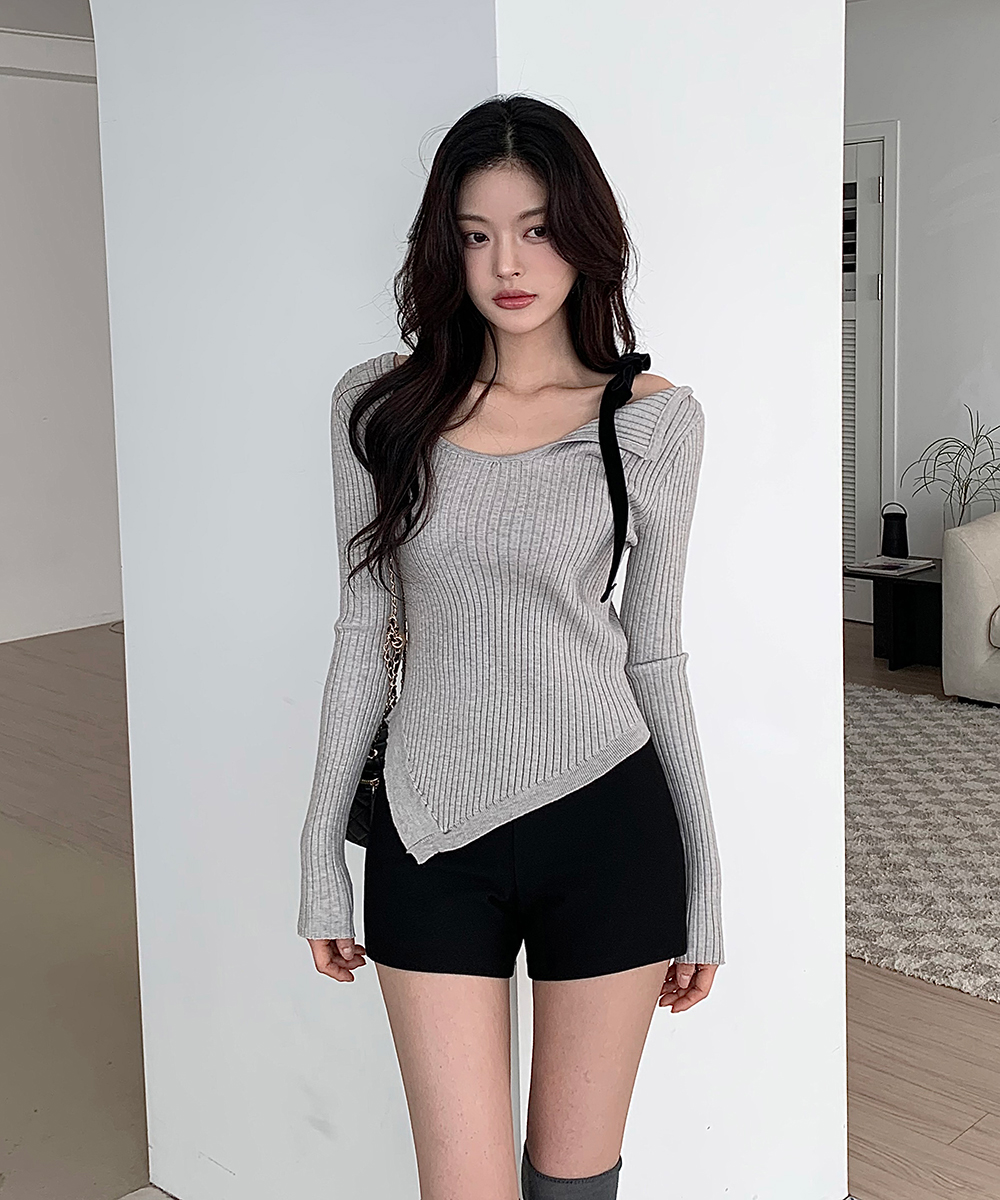 [핏보장🖤흘러내림X] 그웬 원 오프숄더 어깨끈 리본 골지 사선 밑단 긴팔 니트 겨울 봄 가을 / 글램 어깨트임 비대칭 데이트룩 하객룩 연말룩 클래식블랑