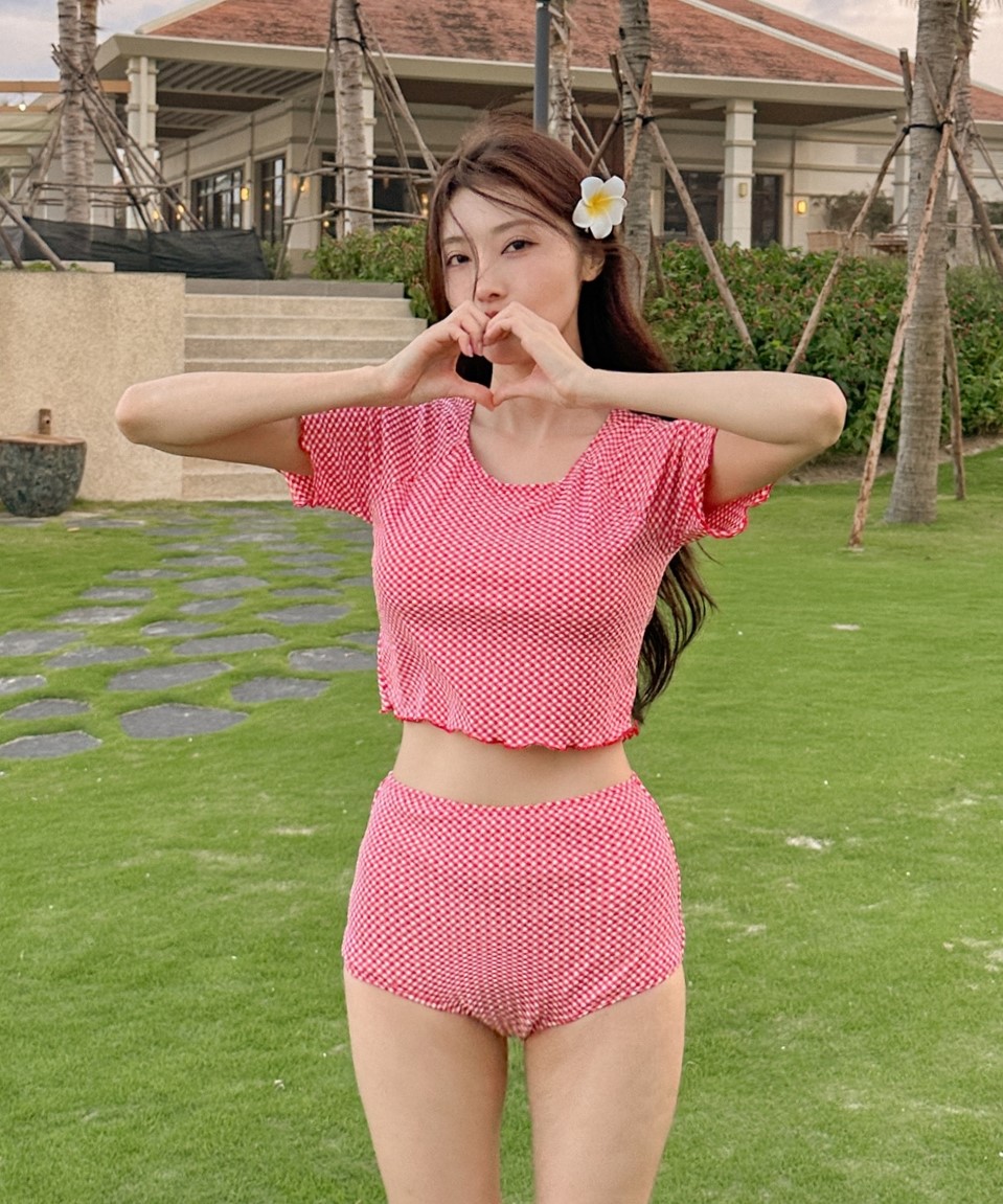 🍒진짜예쁨🍒/M-XL 체크 반팔 하이웨스트 커버업 비키니 유교걸 휴양지 투피스 빅사이즈 수영복