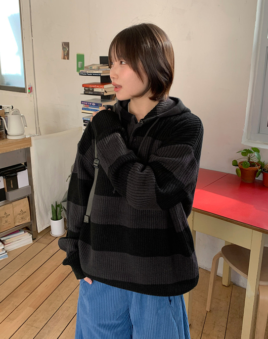 [unisex] 코리니 스트라이프 버튼 오버 후드 니트 (5color)