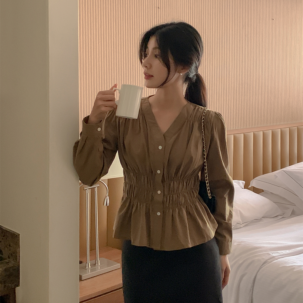 샤르트 브이넥 웨이스트 셔링 페플럼 블라우스(하객룩)