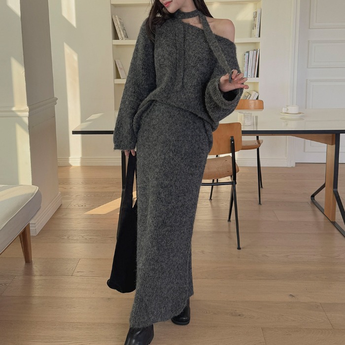 그로우즈 울 니트세트 타이 세트 스카프 보트넥 헤어리 부클 오프숄더 롱스커트 세트