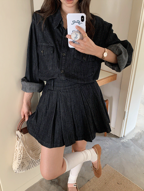 [셋업🥰] 리드 데님 셔츠 +플리츠 미니스커트 셋업 SET1060간절기 봄 여름 기본 베이직 하객룩 캠퍼스룩 입학식룩 청 셔츠