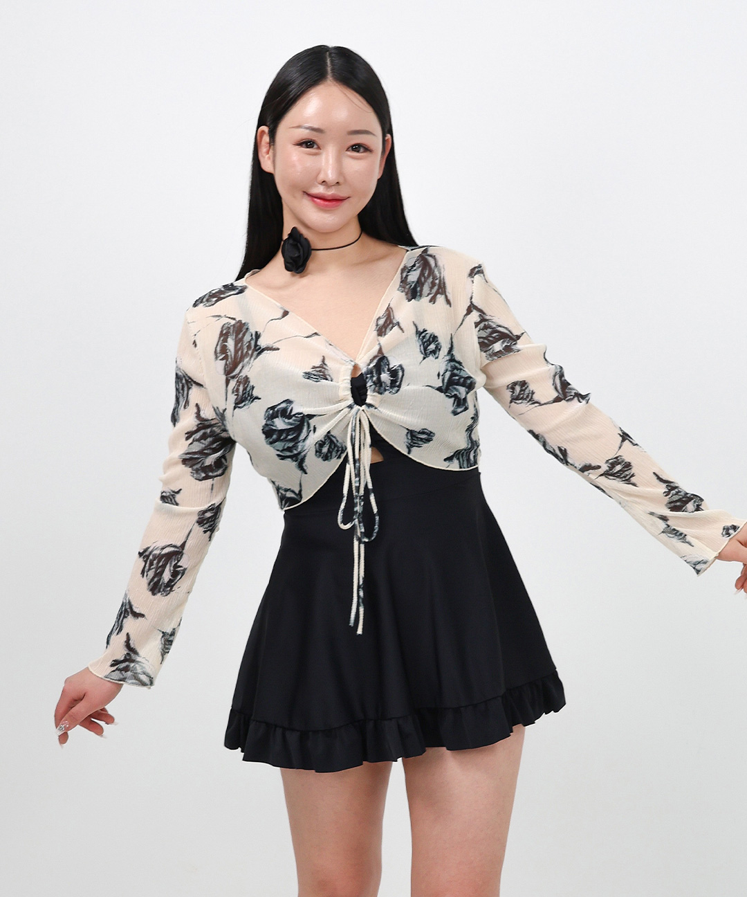 [XL-5XL/빅사이즈] 홀릭 원피스 수영복 체형커버 플라워 긴팔 셔링 래쉬가드 + 커버업 2피스 세트