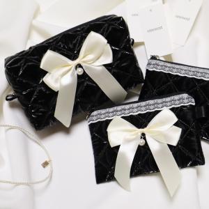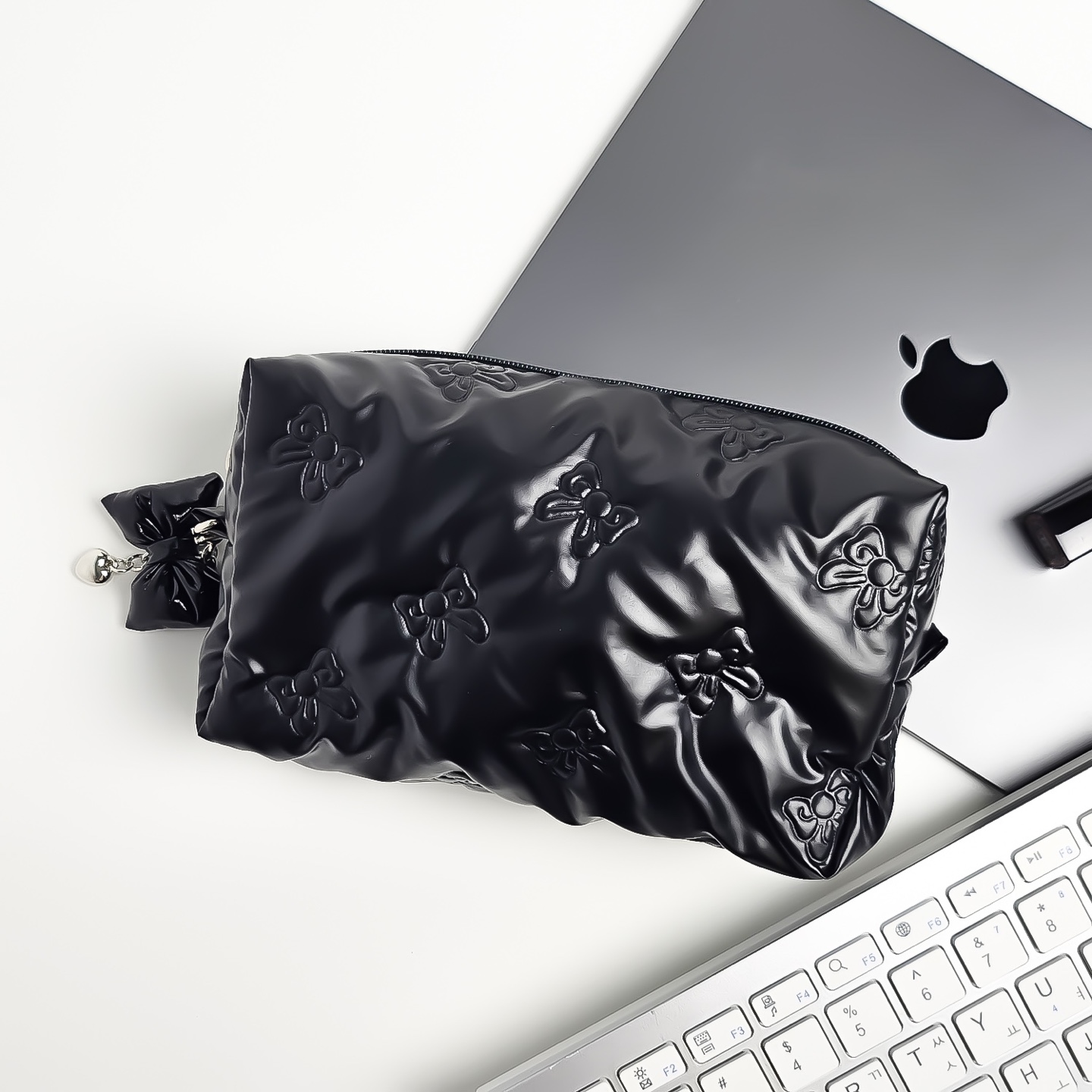 [자체제작/빠른출고] 블랙 누빔 리본 사각 지퍼 화장품 대용량 파우치