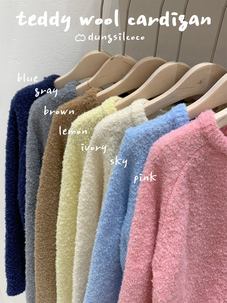[🤎색감맛집] 테디 부클 울 가디건 , 라운드넥 뽀글이 후리스 양털 세미 크롭 나그랑 화이트 겨울 봄 간절기 파스텔 미디 숏 미니 니트 단추 루즈핏 아이보리 핑크 하늘색 브라운