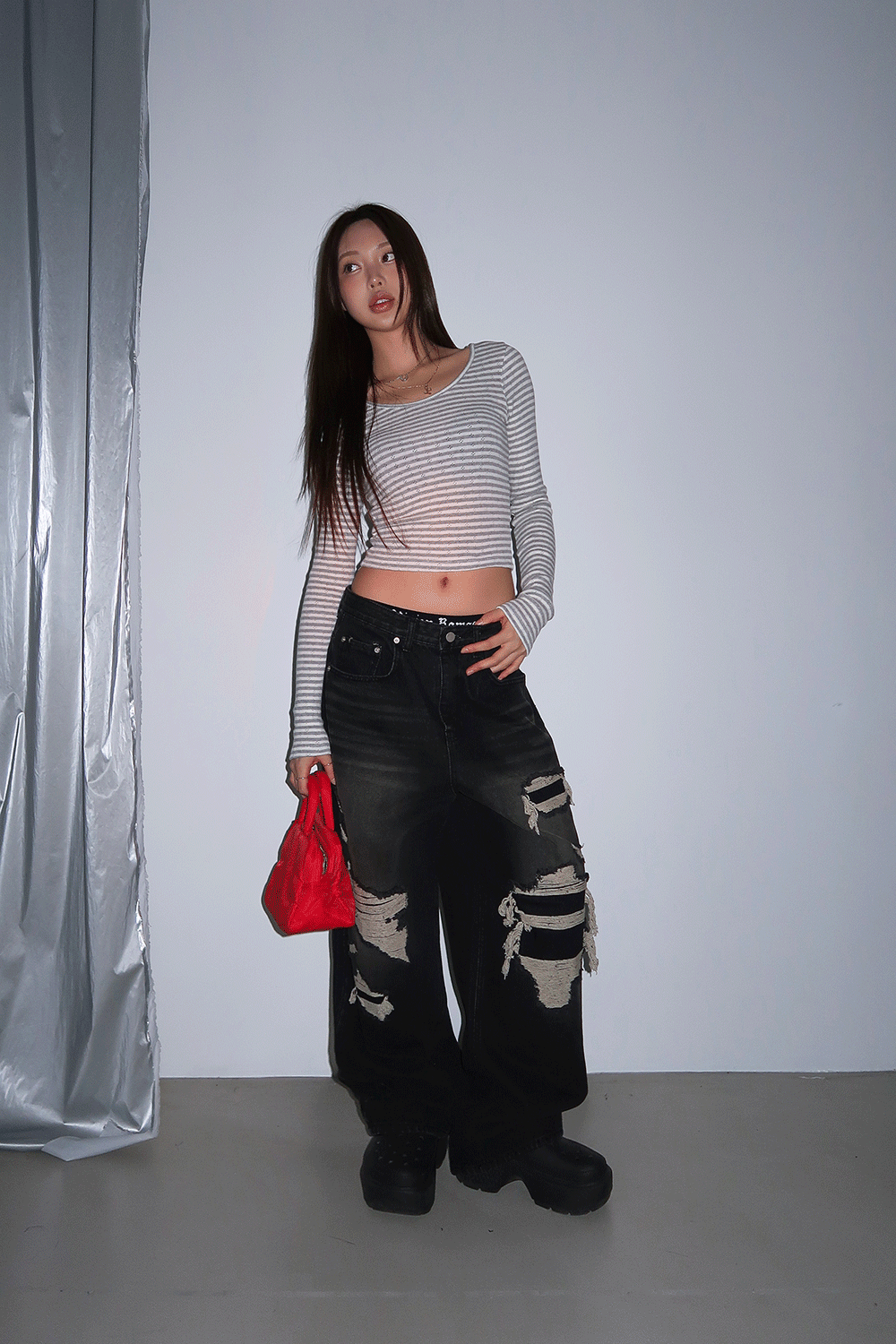 TAX DAMAGED WIDE BLACK DENIM / 택스 데미지드 와이드 블랙 데님