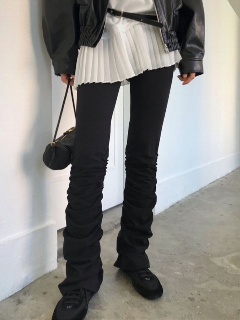 위아 바지 여성 포인트 쫄바지 포인트 유니크 레이어드 밴딩 셔링 레깅스 팬츠 (블랙)