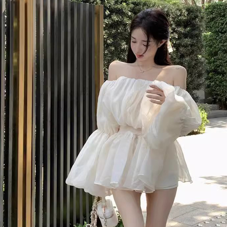 (당일출고) 긴팔 밴딩 오프숄더 벌룬 슬림핏 캉캉 플레어 쉬폰 셔링 롱 봄 블라우스 미니 원피스 데이트룩 2color