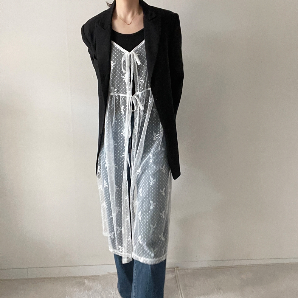 리본 도트 레이어드 뷔스티에 롱 원피스 오간자 시스루 투명 레이스 국내제작