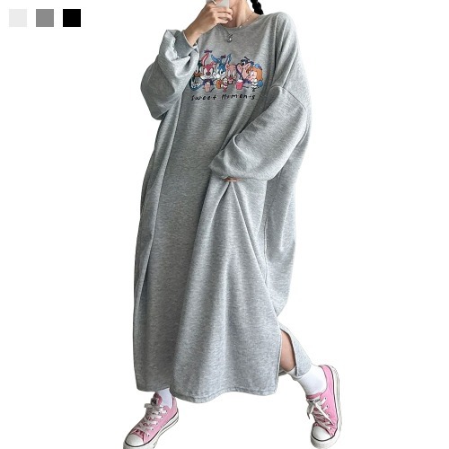 25SS 플러스사이즈 맥시기장 박스롱원피스 라운드넥 카툰프린트 99사이즈