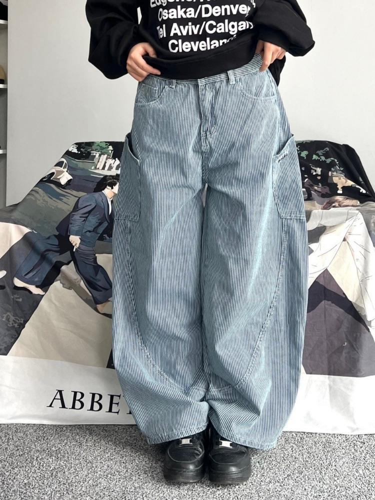 [유니크힙/S~XL]스트라이프 자수 레터링 벌룬 와이드 카고 팬츠