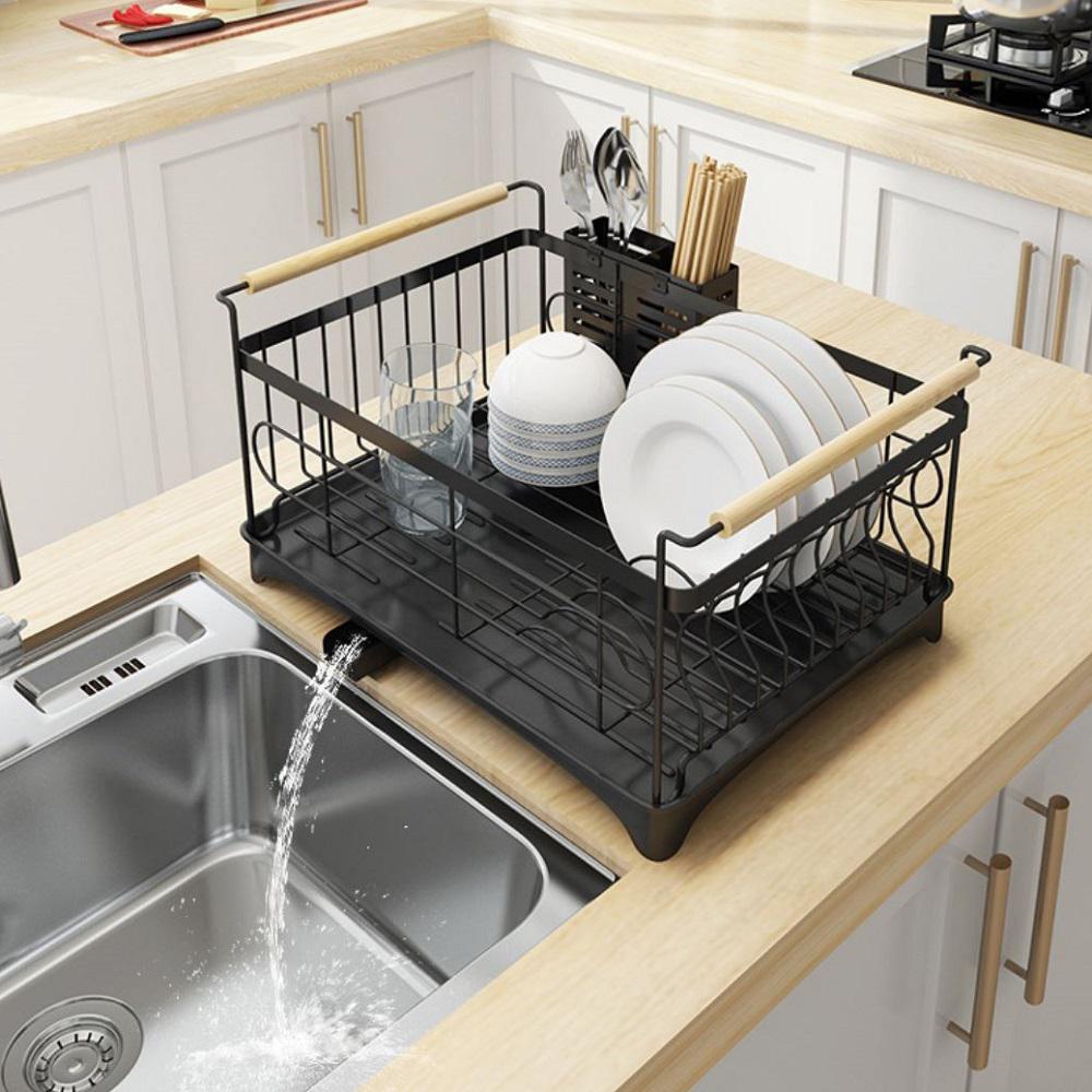 우드 손잡이 자동 물빠짐 스텐 식기건조대