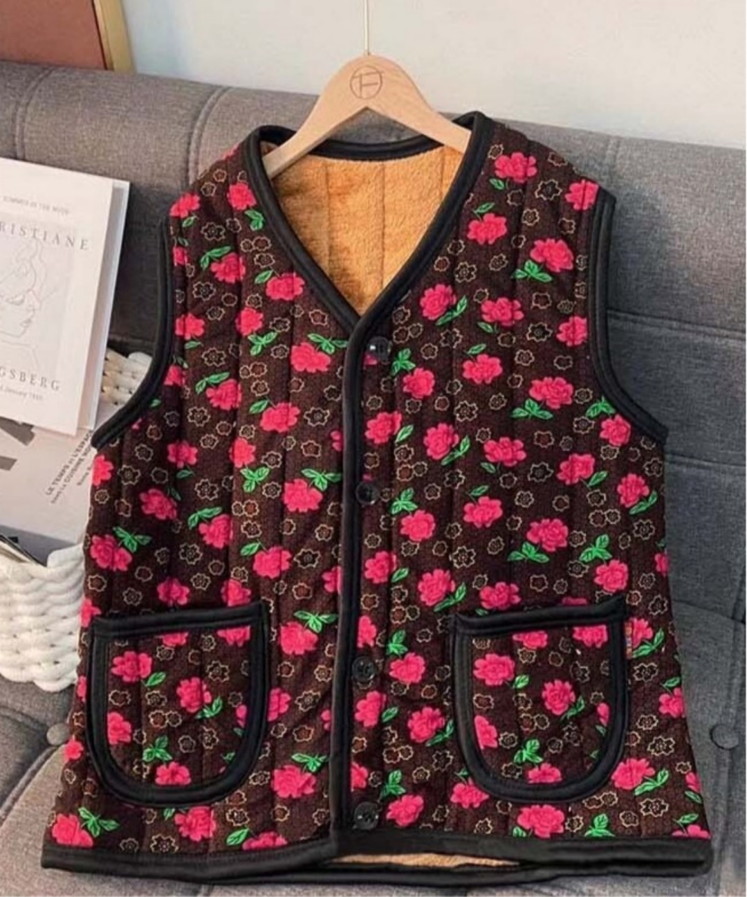요양원 어르신 선물 할매니얼 촌캉스룩 김장룩 시골 패션 레트로 할머니 누빔 털조끼 성인 수면 조끼 졸업 사진 컨셉 촌캉스 기모 꽃무늬 실내 농사 융털 겨울 할미룩 AA0023
