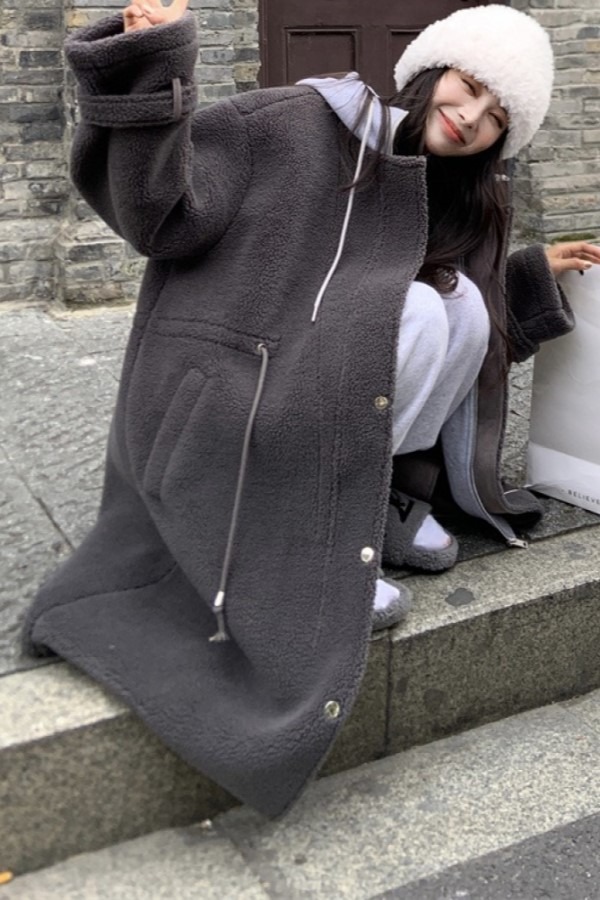 로이피 양털 후드 긴팔 오버핏 롱코트