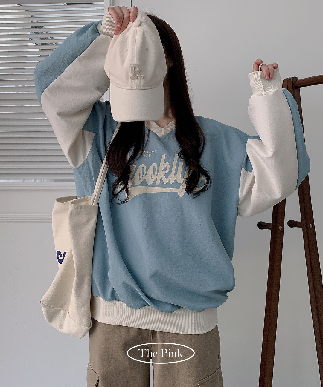 [커플템!/데일리템/꾸안꾸] 클릿 오버핏 브이넥 나일론 배색 프린팅 맨투맨 (3color)