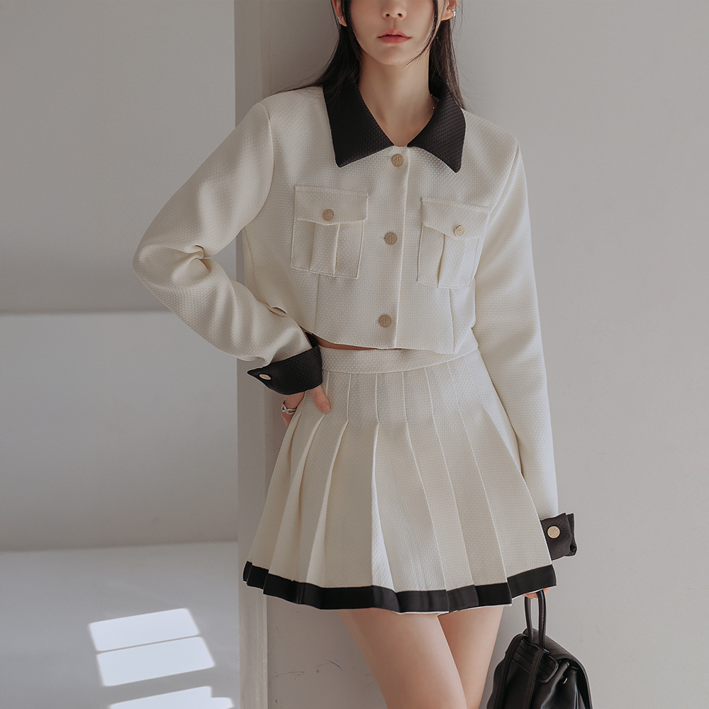린프 트위드 자켓 플리츠 스커트 2 피스 세트 (가을/간절기/골드버튼/컬러링/하객룩/격식룩/프레피룩/데일리룩)
