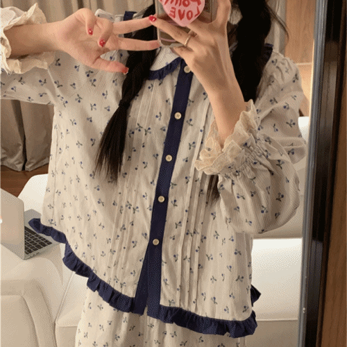 러블리 블루베리 사계절 긴팔 프릴 잠옷 세트 (1color)