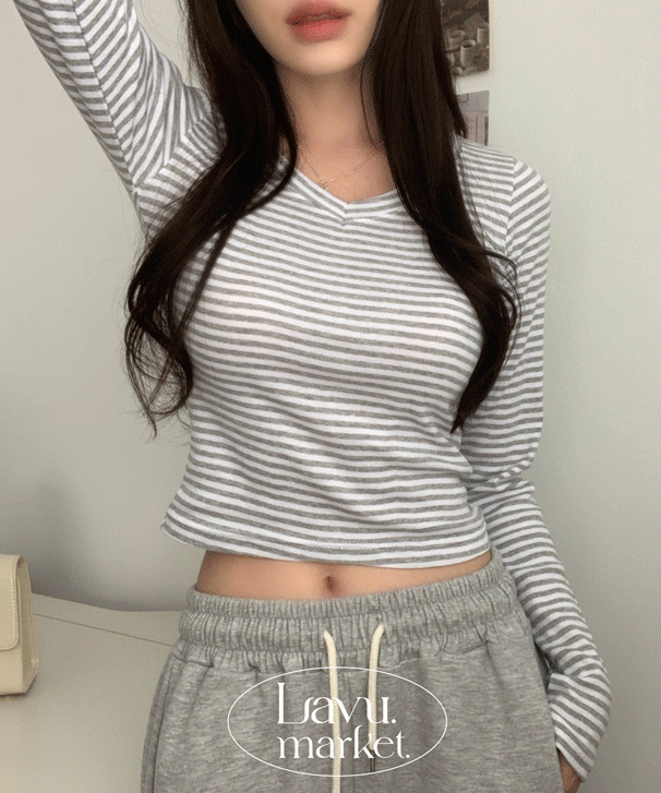 남심 트리거! 리제 브이넥 스트라이프 슬림핏 크롭 긴팔티 3color[줄지/줄무늬/단가라/브이넥면티/면티/기본티/크롭티]