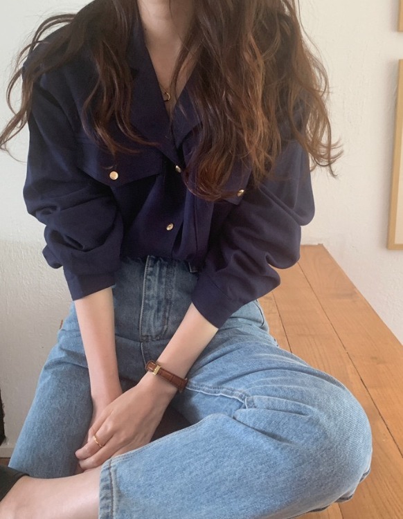 (자체제작)굿모닝 가을 간절기 실키 양포켓 골드버튼 루즈핏 카라넥 긴팔 블라우스 남방 셔츠