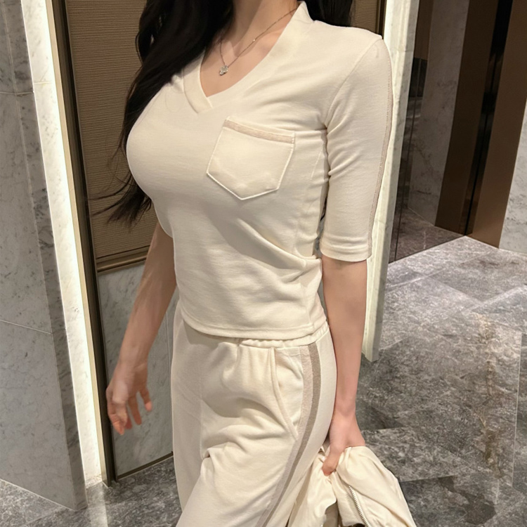 (당일출고/set) 반팔 브이넥 배색 슬림핏 배색 두줄 크롭 티셔츠 밴딩 와이드 트레이닝 추리닝 팬츠 바지 투피스 세트 2color