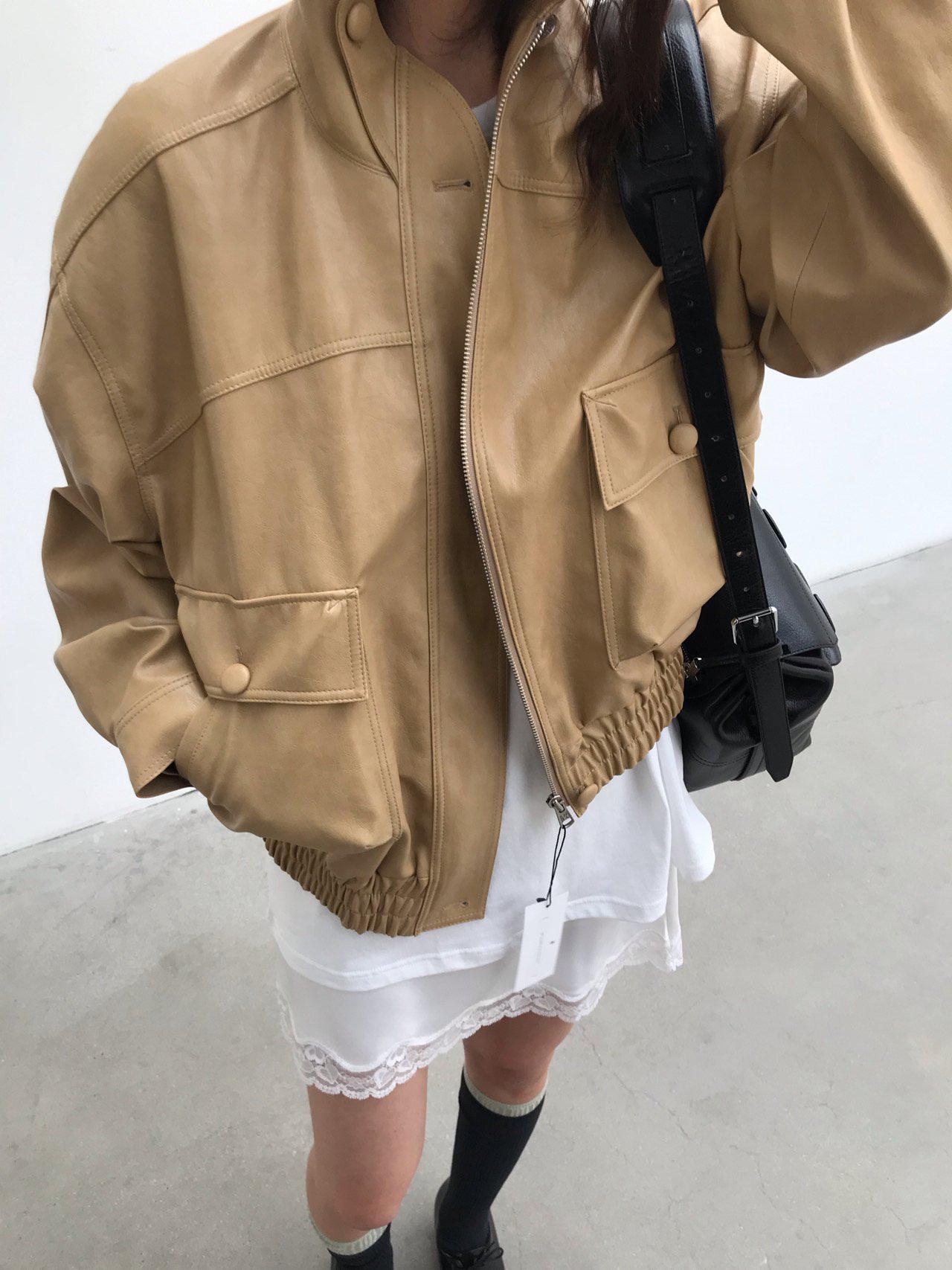 봄 오버핏 하이넥 레더 버틀러 블루종 점퍼