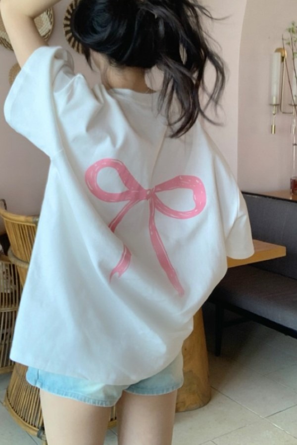 세이나 리본 프린팅 라운드넥 반팔 루즈핏 티셔츠