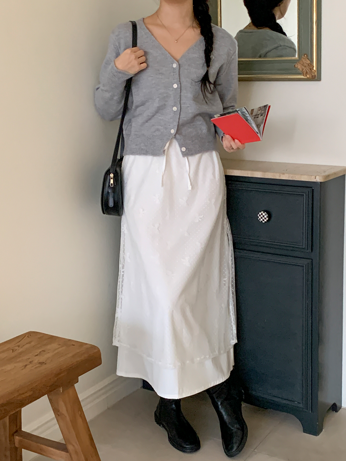 [빠른배송/레이어드스커트] 레이어드 스커트 샤 도트 리본 레이스 셔링 레이어드치마 하객룩