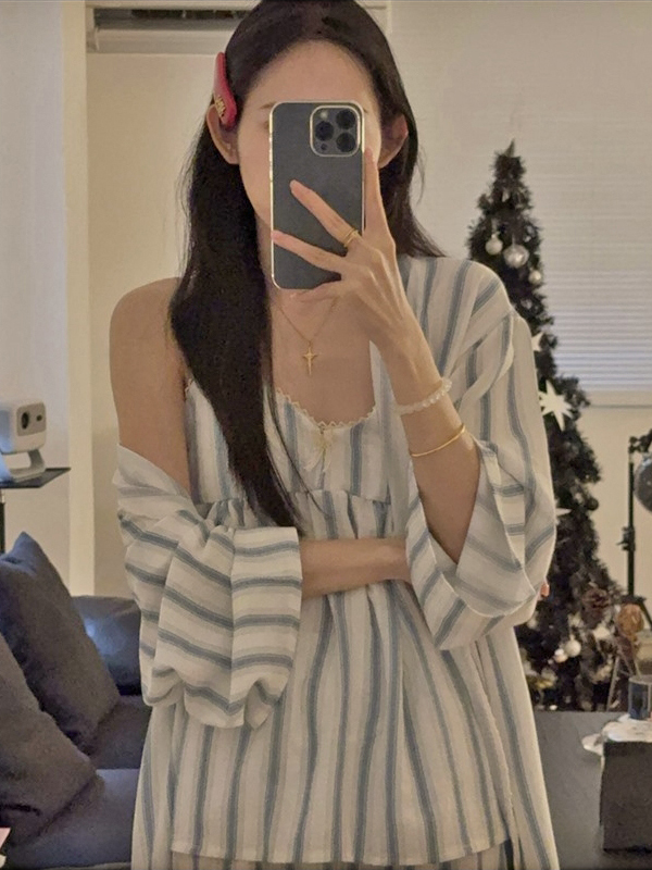 [캡내장] 미드블루 3pcs 민소매 로브 상하세트 파자마 잠옷