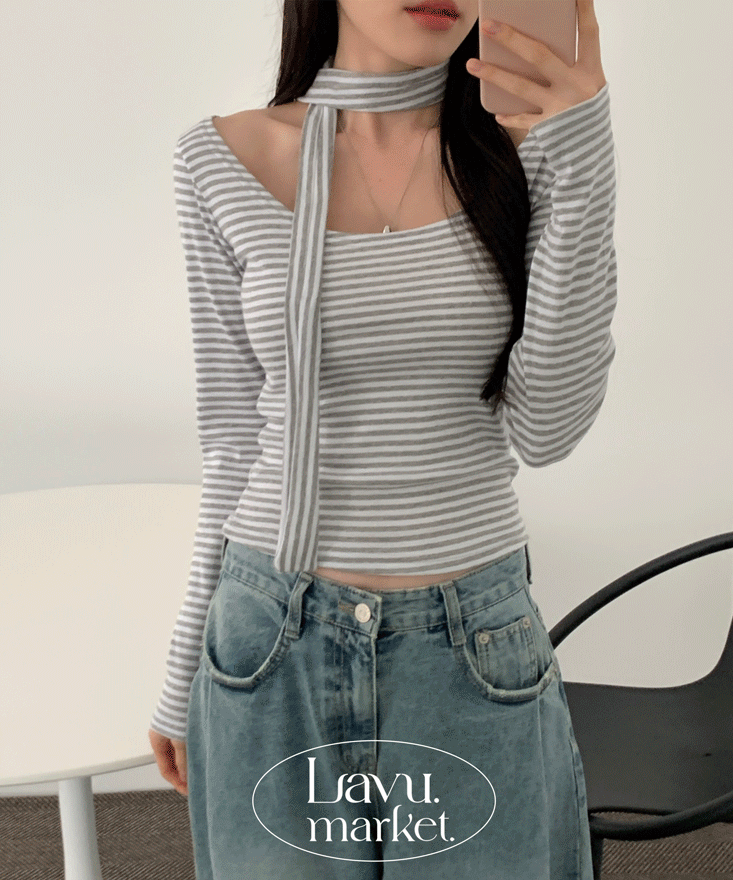 초커 세트! 미샤 스트라이프 딥유넥 슬림핏 크롭 긴팔티 3color [초커티/머플러/초커리본/단가라티/유넥긴팔티/면티]
